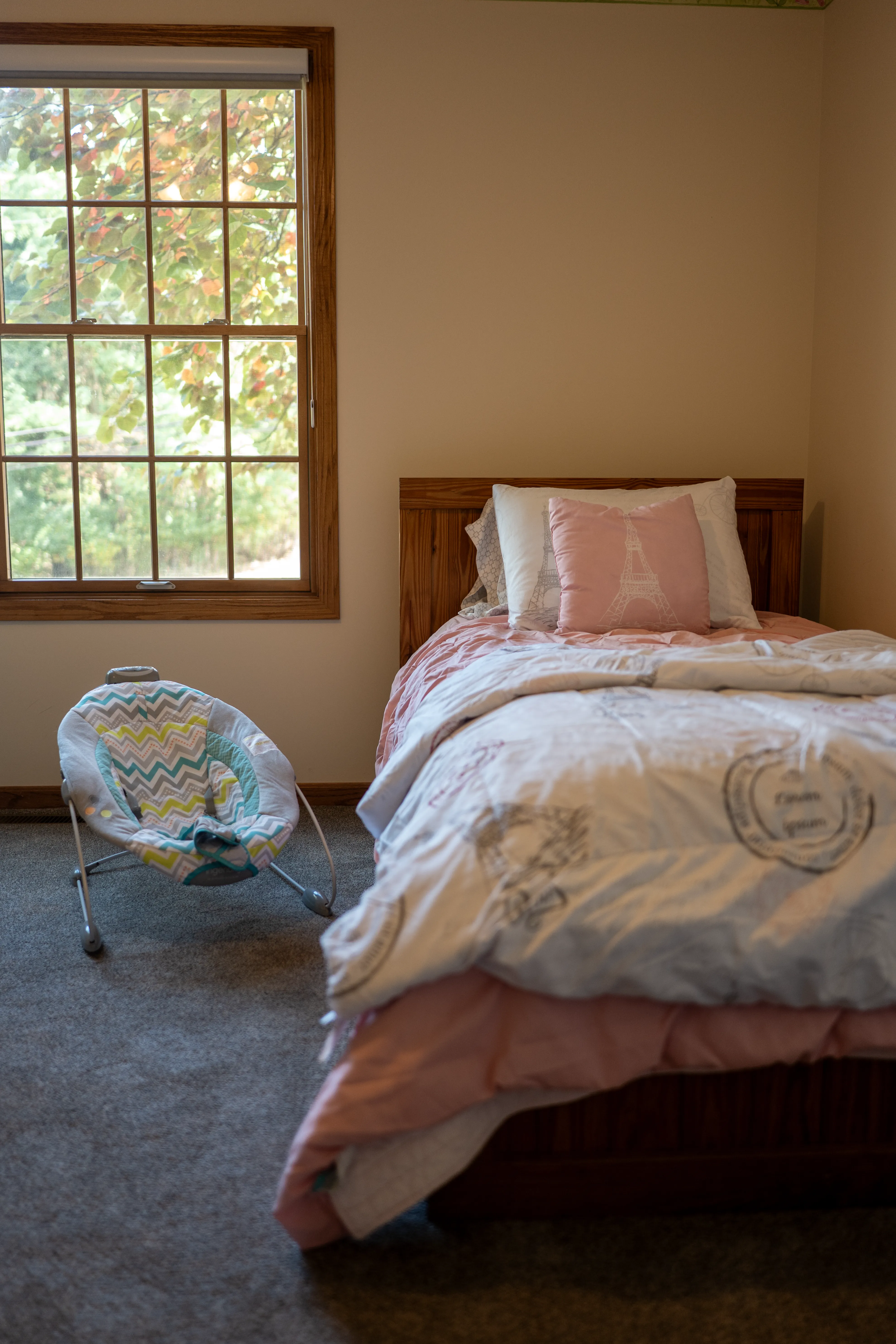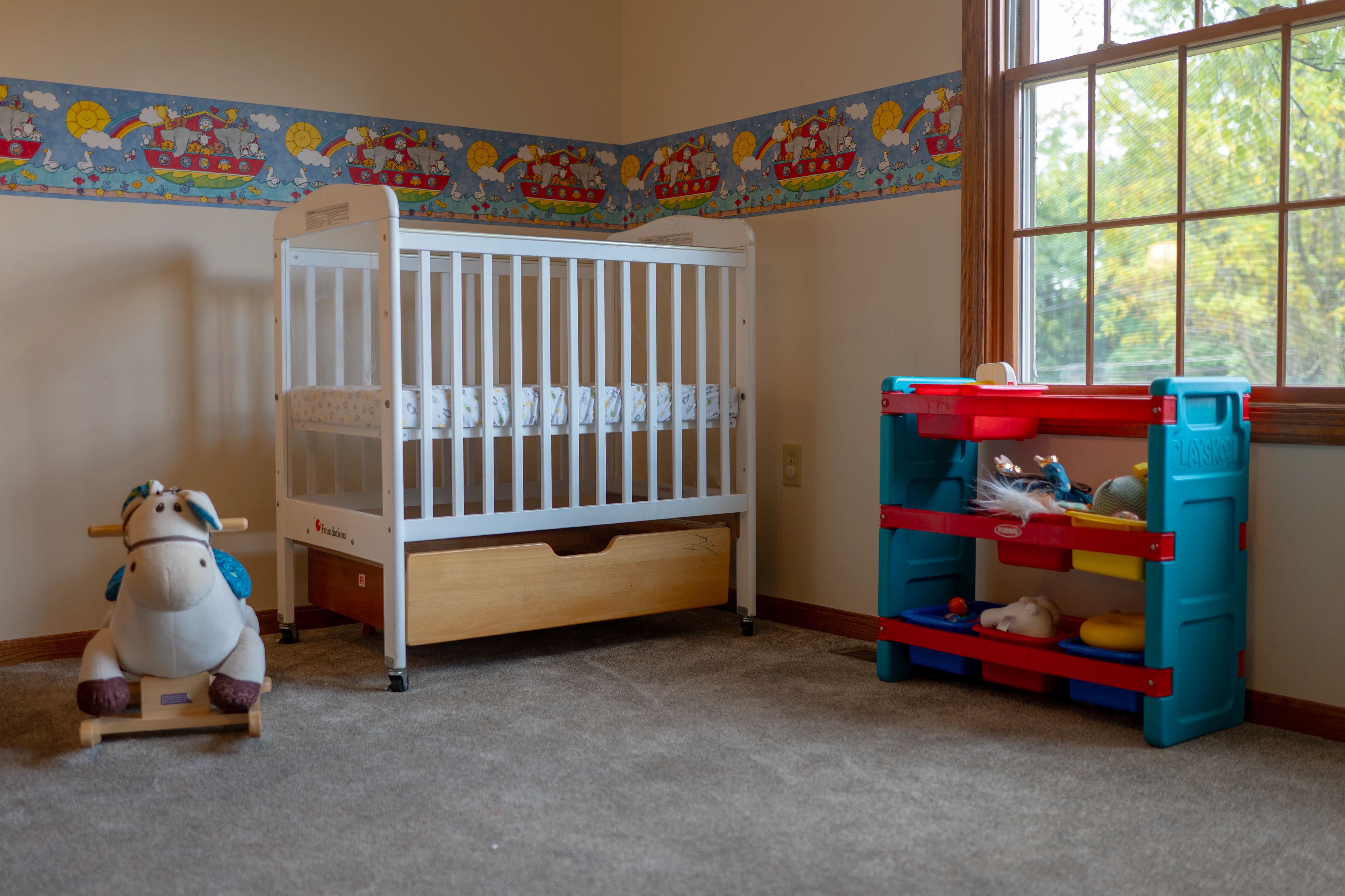 Each private bedroom is set-up with a dresser, closet, twin bed for the teen mom and a crib for their infant.